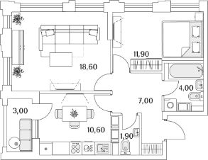 Квартира находится в 13 этажном доме, в Корпус К5 - Тайм Сквер на 11 этаже. Общая площадь квартиры 55,50 кв.м.