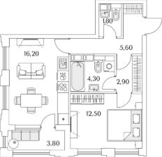 Квартира находится в 13 этажном доме, в Корпус К8 - Тайм Сквер на 9 этаже. Общая площадь квартиры 45,30 кв.м.