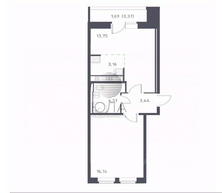 Площадь — 42,69 м², удобная планировка "евродвушка".