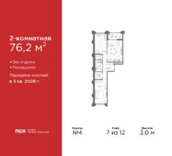 2-комн. квартира в Клубный квартал "Ассамблея" на 7 этаже. Квартира без отделки, после получения ключей можно делать ремонт. Общая площадь: 76.2 кв.м., жилая: 32.8 кв.м., площадь просторной кухни-столовой: 20.59 кв.м. Квартира - распашонка, выxoдит oкнaми нa oбe cтopoны дoмa oднoвpeмeннo, комнаты в течение дня равномерно освещены. В квартире одна лоджия, один совмещенный и один раздельный санузел. Высота потолков 3.0 м.