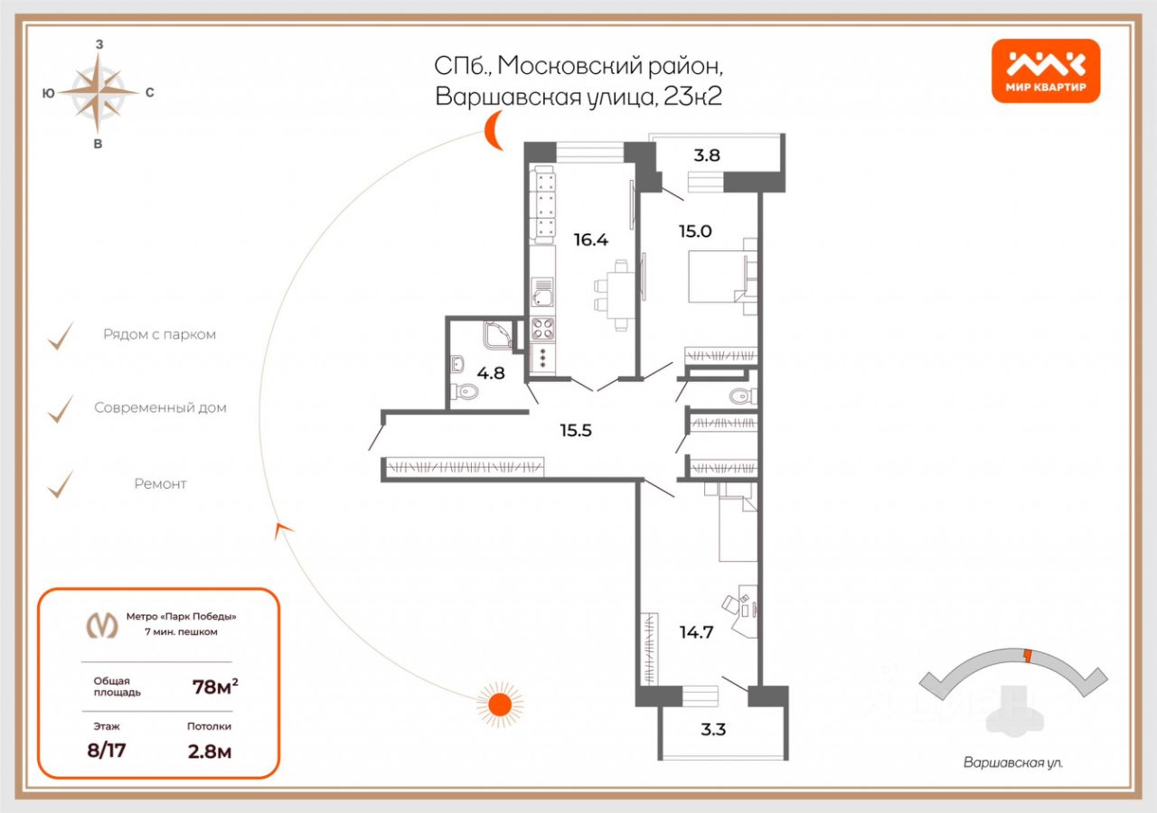 До метро Парк Победы меньше 10 минут пешком, рядом Московский проспект, удобные выезды на КАД и ЗСД, легко добираться в аэропорт и в центр города.