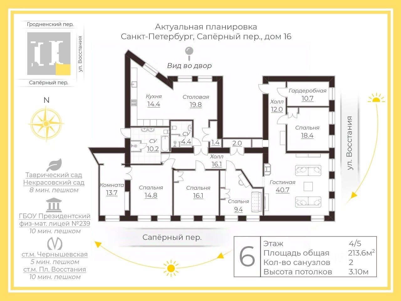 Из квартиры открывается вид на особняк И.К. Мясникова (ул. Восстания) и Саперный переулок. Окна кухни выходят во двор.