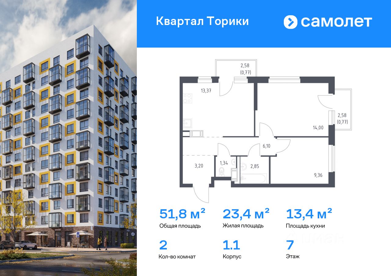 Строим кварталы для жизни с заботой о будущем. Предлагается 2-комнатная квартира комфорт-класса 51,76 кв.м в корпусе 1.1 на 7 этаже, в ЖК "Квартал Торики"