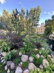 - во дворе разбит очень красивый сад с розами, елями и дорожками между ними