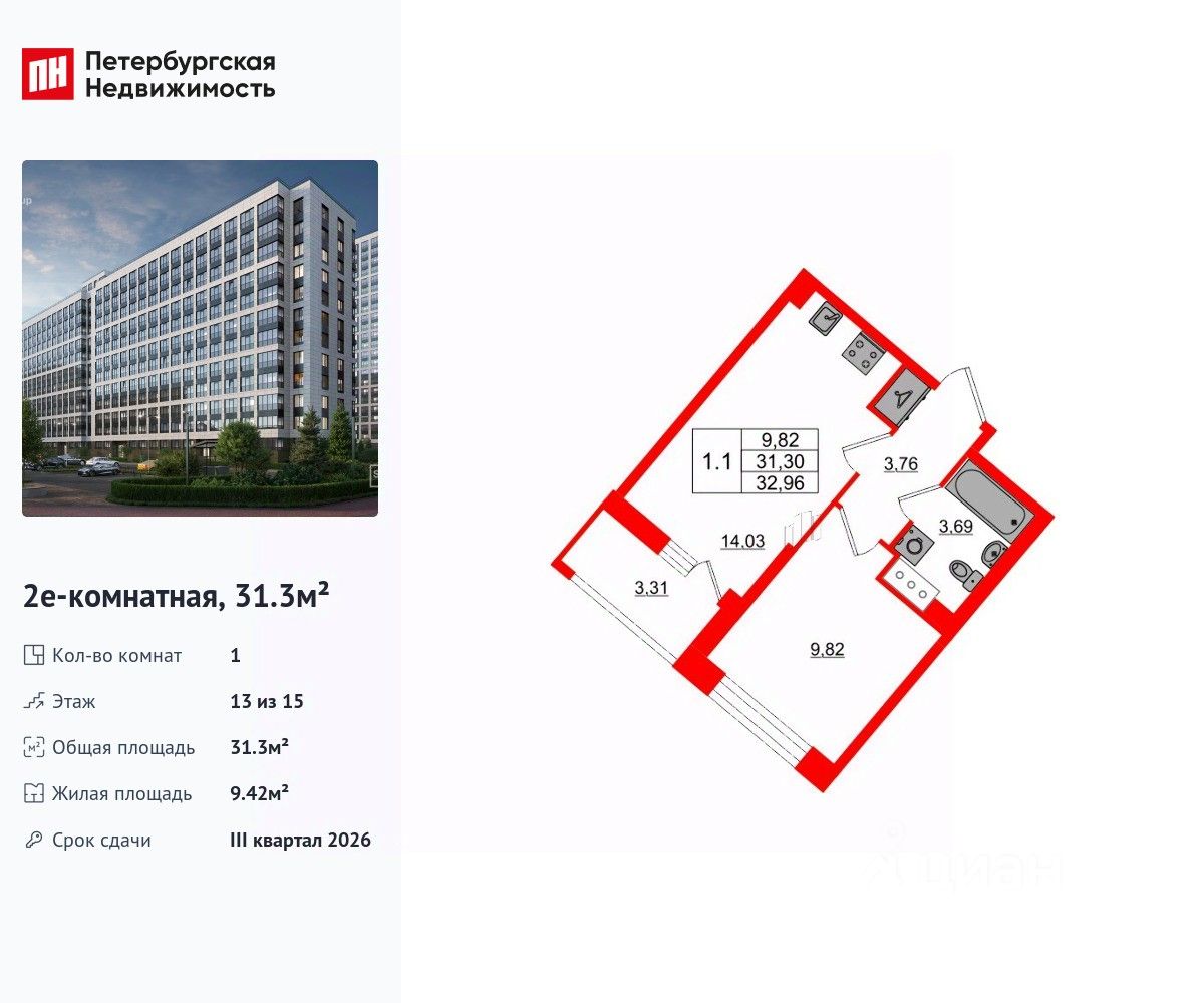 Удобная, классическая, функциональная европланировка, большая кухня-гостиная 14.03 м², вместительная прихожая 3.96 м². Общая площадь квартиры - 31.3 м², жилая 9.42 м², высота потолка 2.75 м.
