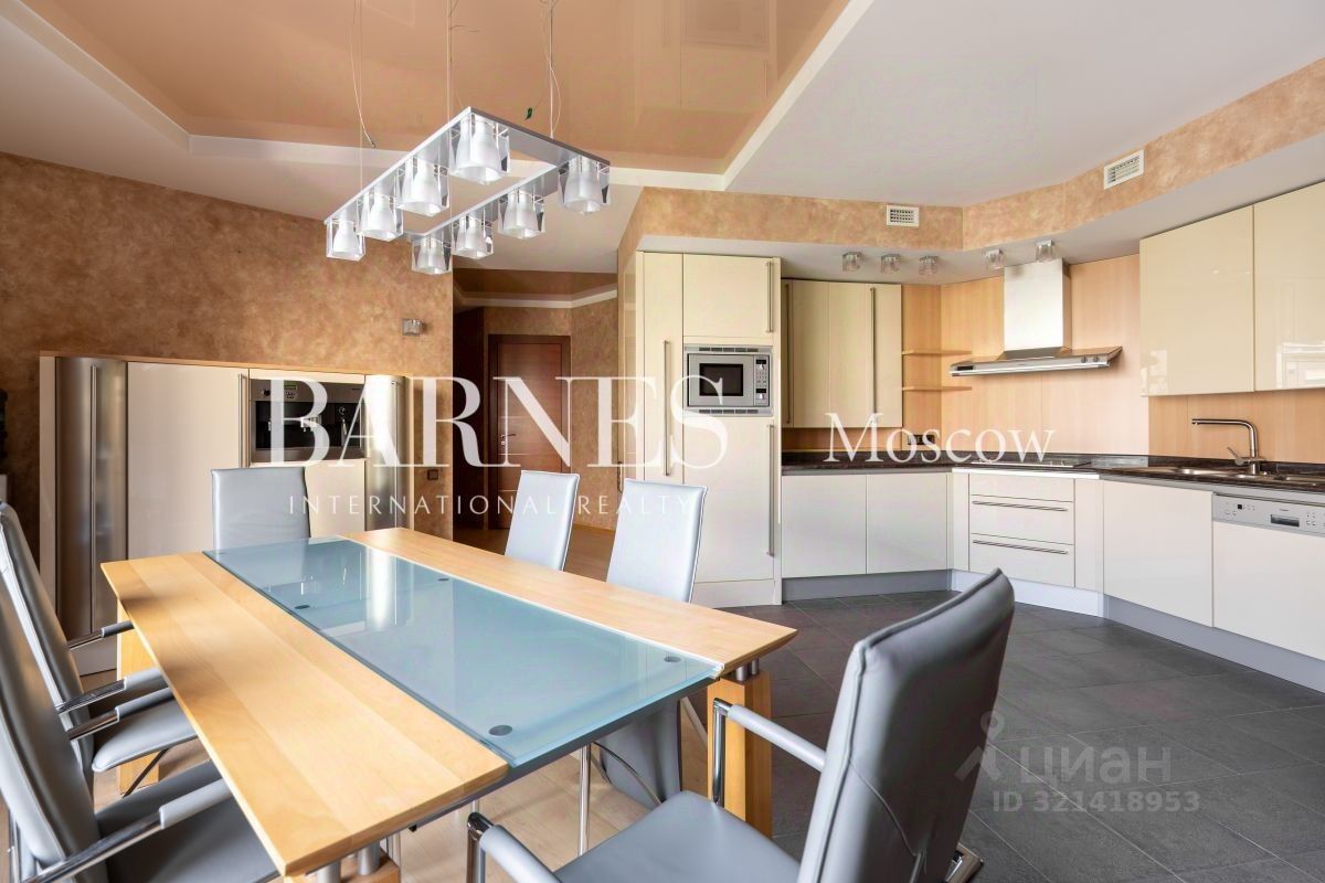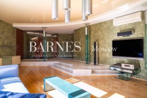 Планировка: Квартира создана из двух квартир с грамотным зонированием пространства для комфортного проживания большой семьи. Все комнаты расположены далеко друг от друга. В квартире имеются 2 изолированные спальни, кабинет, гостиная с действующим камином из натурального оникса и водопадом, а также кухня-столовая, итальянского производителя, площадью 29,6 м2 укомплектованная техникой MIELE и GAGGENAU.