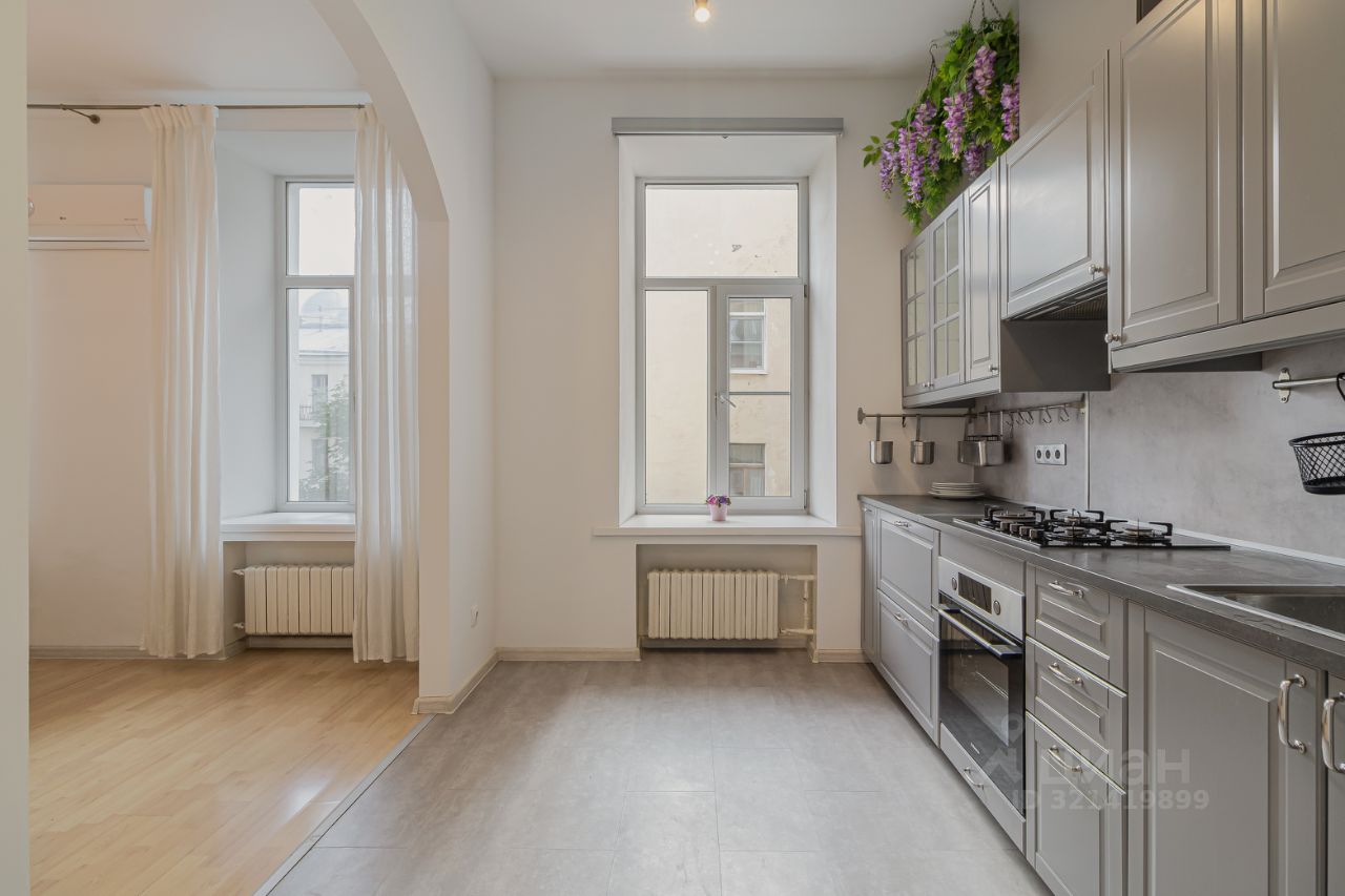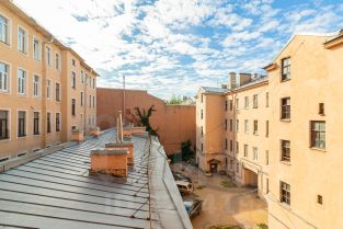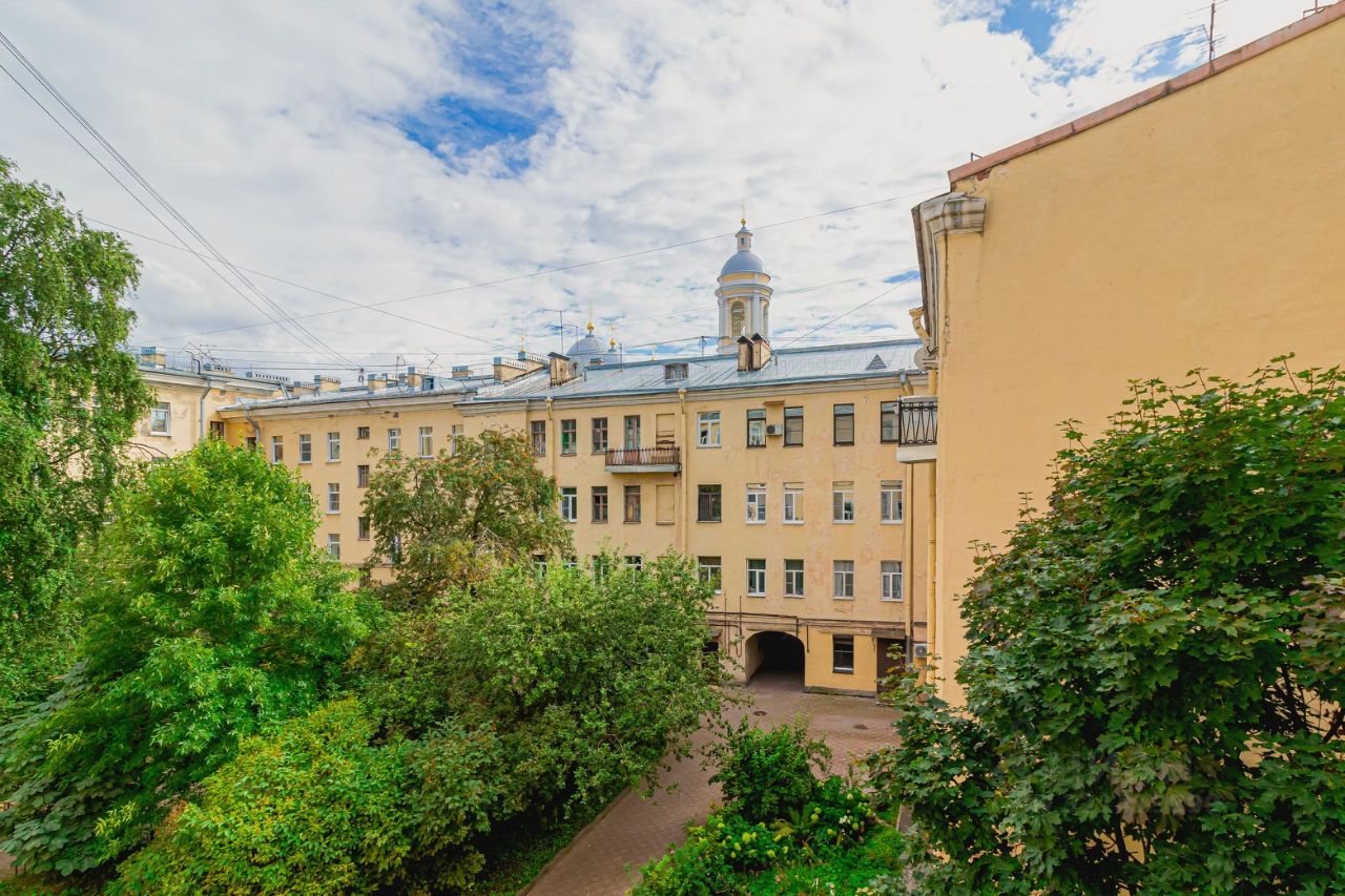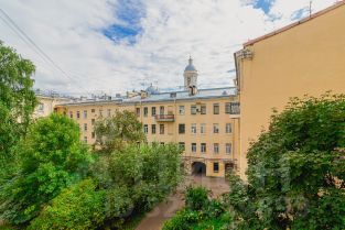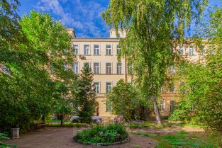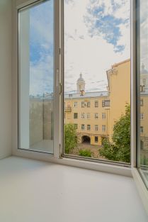 Вход в парадную со двора. Квартира расположена на комфортном третьем этаже. Большое количество окон делают ее очень светлой. Окна выходят в тихий зеленый двор с отреставрированными фасадами, над которыми возвышаются золотые купола Князь-Владимирского собора.