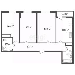 Трёхкомнатная квартира - 12,12кв.м + 16,26кв.м + 16,28кв.м, в которой выполнен хороший косметический ремонт, окна выходят во двор с восточной стороны. Просторный коридор 9,71кв.м, где можно разместить места под хранения. Кухня - 17,72кв.м с выходом на застекленный балкон.Два санузла- первый 4,35кв.м с ванной, второй 3,38 со стиральной машиной и умывальником, полы обогреваемы