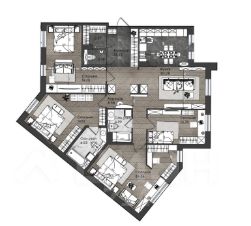 Планировка продуманная и удобная: вместительная прихожая с местом для размещения гардеробного шкафа, гостевой санузел и гардеробная комната в прихожей зоне, четыре уникальных спальни, кухня-гостиная, два совмещенных санузла. Высота потолков — 3 метра!