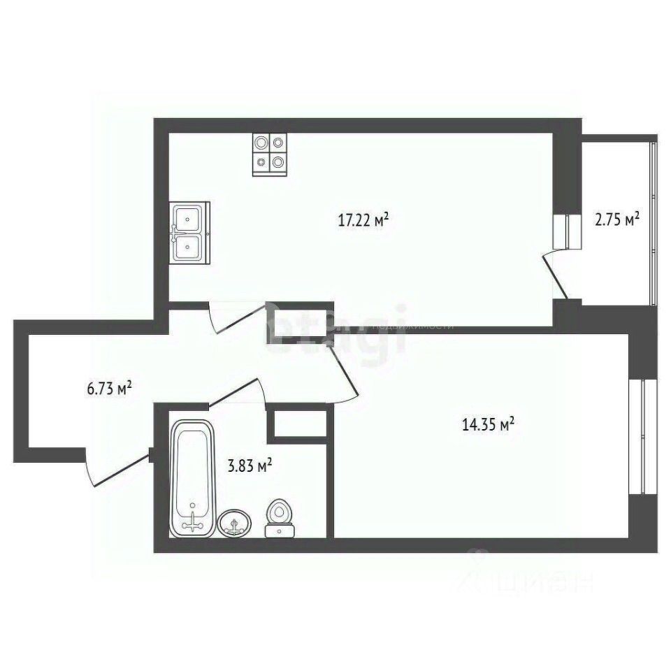 Продаётся однокомнатная квартира площадью 42,13 м.кв + лоджия 2,75 м.кв