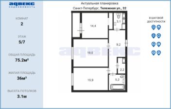 — Гостиная 20 кв.м., которую можно переоборудовать в третью спальню.