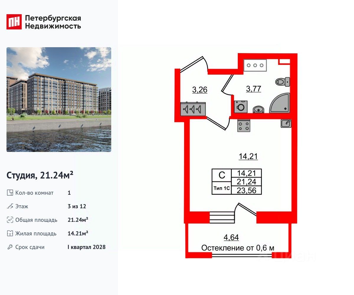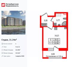Удобная, классическая, функциональная европланировка, просторная прихожая 3.26 м². Общая площадь студии - 21.24 м², жилая 14.21 м², высота потолка 2.77 м.