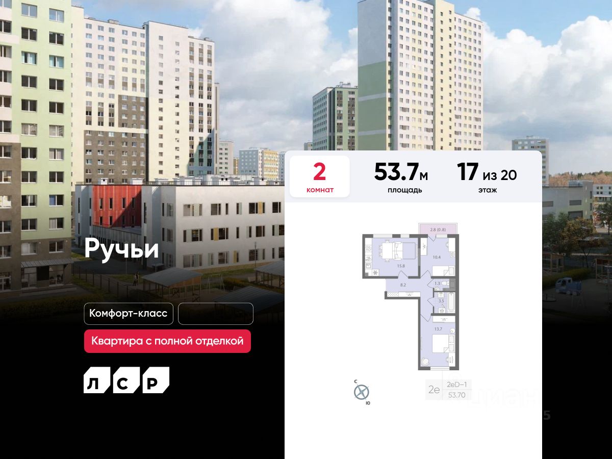 Продаётся 2-комнатная квартира в ЖК "Ручьи" на 17 этаже. Общая площадь составляет 53.70 кв. м. Квартира с чистовой отделкой. Жилой комплекс "Ручьи" располагается по адресу Санкт-Петербург, Красногвардейский. ЖК "Ручьи" - крупный проект комфорт-класса в Красногвардейском районе, на Пискаревском проспекте. В новостройке эргономичные планировки, уютные пешеходные дворы без машин, с детскими и спортивными площадками. Расположение комплекса: • 10 минут до станции метро "Академическая" на автобусе; • 10 минут до ж/д станции "Ручьи"; • 5 минут до КАД на автомобиле. Первая очередь уже заселена, во второй очереди появятся 27 домов. Квартиры передаются с отделкой. Парадные устроены на уровне земли - без ступеней и высоких порогов, а зайти внутрь можно как со стороны двора, так и с улицы. ЛСР построит на территории комплекса школу и два детских сада. Между домами будут обустроены игровые и спортивные площадки с турниками и тренажерами, удобные зоны отдыха для детей и взрослых. Первые этажи отведены под колясочные, магазины и сервисные службы. Здесь есть всё необходимое для комфортной жизни: магазины, аптеки, парикмахерские, пекарни и кофейни, достаточно спуститься на лифте во двор своего дома. Вокруг квартала пройдет велодорожка. Преимущества комплекса: - Большой выбор семейных квартир с просторной кухней-гостиной - Рядом Муринский и Пискаревский парки - Безбарьерная среда - Развитая социальная инфраструктура - Двор без машин Успейте приобрести квартиру на выгодных условиях! Чтобы узнать подробности, обращайтесь за консультацией по телефону.