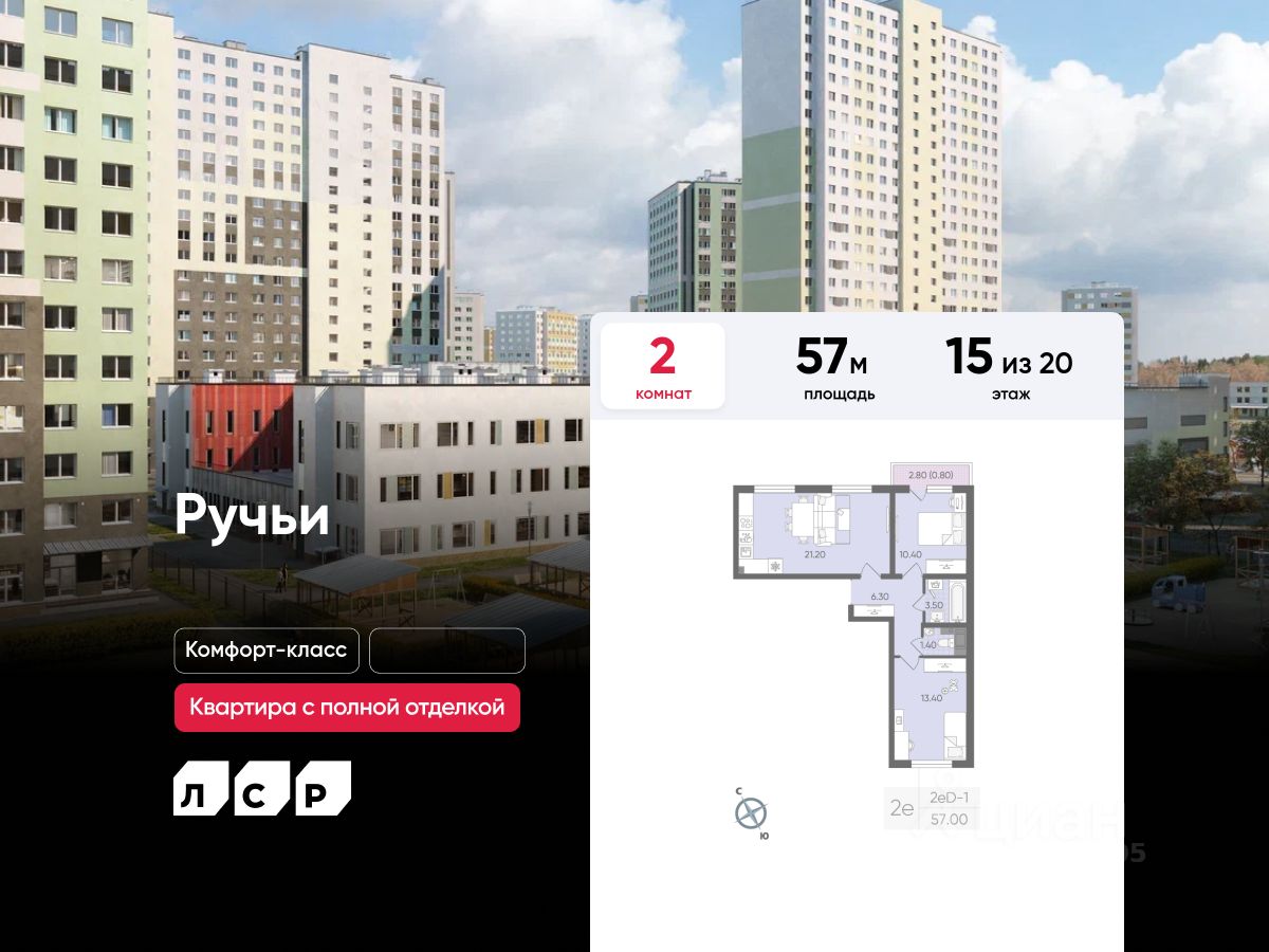 Продаётся 2-комнатная квартира в ЖК "Ручьи" на 15 этаже. Общая площадь составляет 57.00 кв. м. Квартира с чистовой отделкой. Жилой комплекс "Ручьи" располагается по адресу Санкт-Петербург, Красногвардейский.