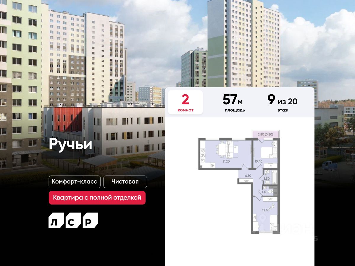 Продаётся 2-комнатная квартира в ЖК "Ручьи" на 9 этаже. Общая площадь составляет 57.00 кв. м. Квартира с чистовой отделкой. Жилой комплекс "Ручьи" располагается по адресу Санкт-Петербург, Красногвардейский.