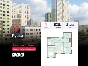 Продаётся 1-комнатная квартира в ЖК "Ручьи" на 2 этаже. Общая площадь составляет 57.50 кв. м. Квартира с чистовой отделкой. Жилой комплекс "Ручьи" располагается по адресу Санкт-Петербург, Красногвардейский.