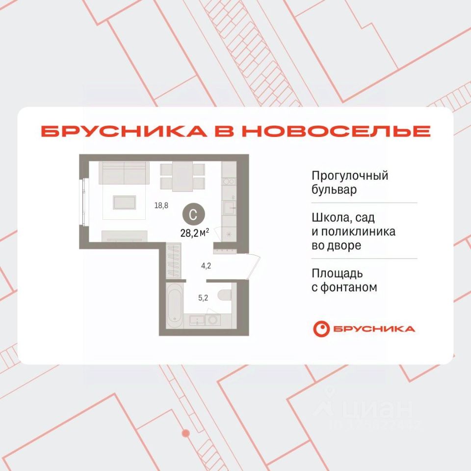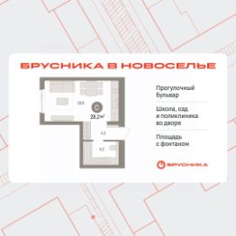 Продается 1-комн. квартира-студия с предчистовой отделкой в ЖК "Брусника в Новоселье" на 4 этаже. Общая площадь: 28.21 кв.м., площадь гостиной 18.8 кв.м., из которых 5 кв.м. выделено под кухонную зону. Все окна выходят на одну сторону. В квартире один совмещенный санузел. Высота потолков 2.7 м.