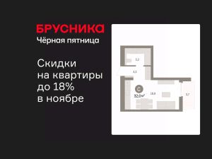 Просторная однокомнатная квартира-студия с предчистовой отделкой в ЖК "Брусника в Новоселье" на 5 этаже. Общая площадь: 31.95 кв.м., площадь гостиной 18.8 кв.м., из которых 5 кв.м. выделено под кухонную зону. Все окна выходят на одну сторону. В квартире один балкон, один совмещенный санузел. Высота потолков 2.7 м.