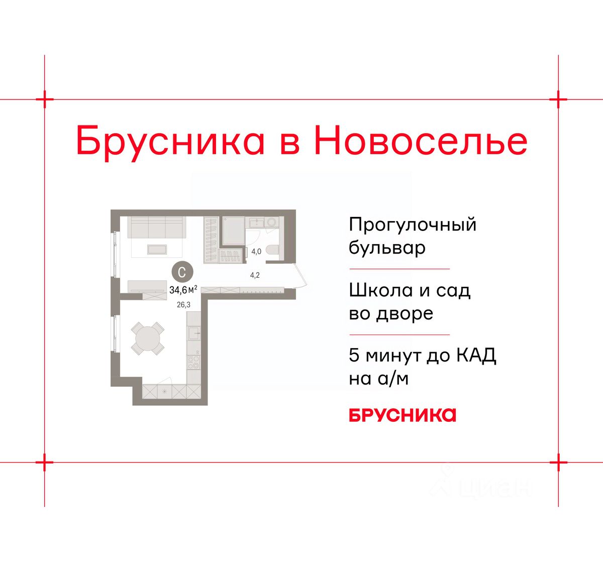 Продается 1-комн. квартира-студия от застройщика с предчистовой отделкой в ЖК "Брусника в Новоселье" на 4 этаже. Общая площадь: 34.55 кв.м., площадь гостиной 26.3 кв.м., из которых 5 кв.м. выделено под кухонную зону. Все окна выходят на одну сторону. В квартире один совмещенный санузел. Высота потолков 2.7 м.