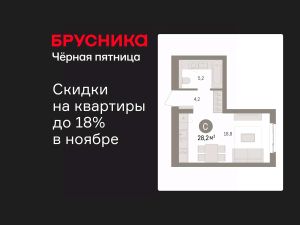 Однокомнатная квартира-студия с предчистовой отделкой в ЖК "Брусника в Новоселье" на 2 этаже. Общая площадь: 28.21 кв.м., площадь гостиной 18.8 кв.м., из которых 5 кв.м. выделено под кухонную зону. Все окна выходят на одну сторону. В квартире один совмещенный санузел. Высота потолков 2.7 м.
