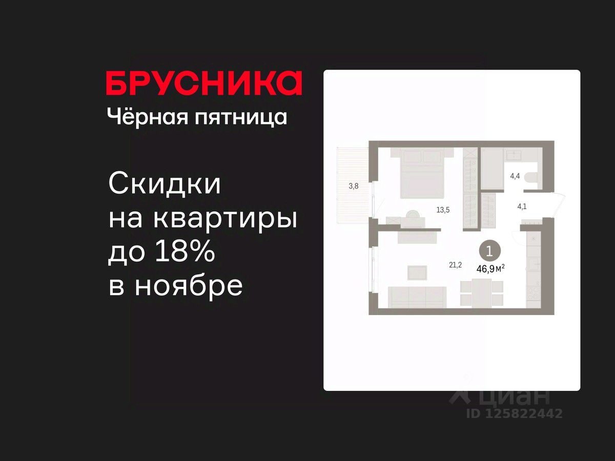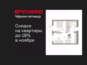 Однокомнатная квартира от застройщика с предчистовой отделкой в ЖК "Брусника в Новоселье" на 7 этаже. Общая площадь: 46.92 кв.м., жилая: 13.8 кв.м., площадь просторной кухни-столовой: 21.2 кв.м. Квартира угловая, очень светлая, естественная вентиляция при открытии окон. В квартире один балкон, один совмещенный санузел. Высота потолков 2.7 м.