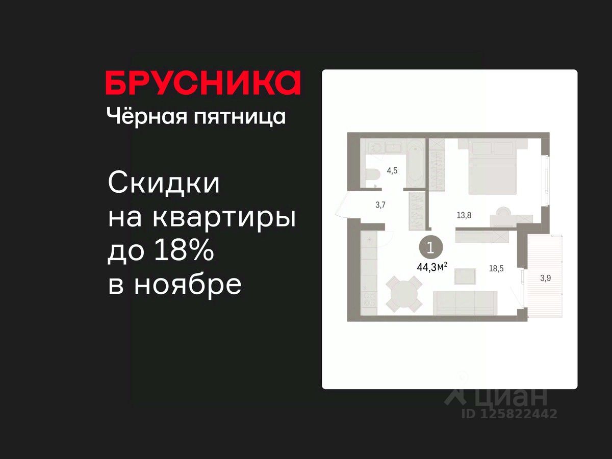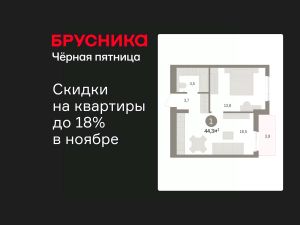 Однокомнатная квартира с предчистовой отделкой в ЖК "Брусника в Новоселье" на 8 этаже. Общая площадь: 44.34 кв.м., жилая: 13.8 кв.м., площадь просторной кухни-столовой: 18.5 кв.м. Все окна выходят на одну сторону. В квартире одна лоджия, один совмещенный санузел. Высота потолков 2.7 м.