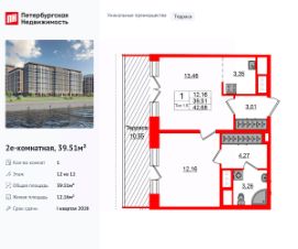 Уникальная, функциональная европланировка, вместительная прихожая 3.01 м². Общая площадь квартиры - 39.51 м², жилая 12.16 м², высота потолка 3.04 м.