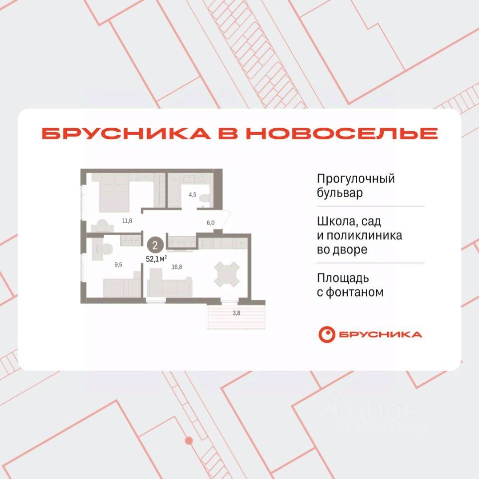 Двухкомнатная квартира с предчистовой отделкой в ЖК "Брусника в Новоселье" на 7 этаже. Общая площадь: 52.11 кв.м., жилая: 21.1 кв.м., площадь просторной кухни-столовой: 16.8 кв.м. Угловая квартира, идеально подойдет любителям тишины и панорамных видов. В квартире один балкон, один совмещенный санузел. Высота потолков 2.7 м.