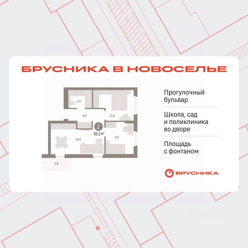 Просторная 2-комн. квартира с предчистовой отделкой в ЖК "Брусника в Новоселье" на 5 этаже. Общая площадь: 52.12 кв.м., жилая: 21.1 кв.м., площадь просторной кухни-столовой: 16.8 кв.м. Квартира угловая, идеально подойдет любителям тишины и панорамных видов. В квартире один балкон, один совмещенный санузел. Высота потолков 2.7 м.