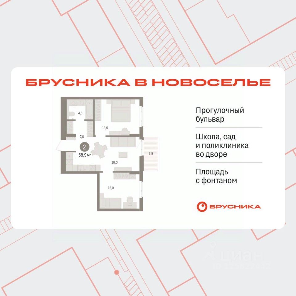 2-комн. квартира с предчистовой отделкой в ЖК "Брусника в Новоселье" на 6 этаже. Общая площадь: 58.85 кв.м., жилая: 25.5 кв.м., площадь просторной кухни-столовой: 18 кв.м. Комнаты изолированные, все окна выходят на одну сторону. В квартире один балкон, один совмещенный санузел. Высота потолков 2.7 м.