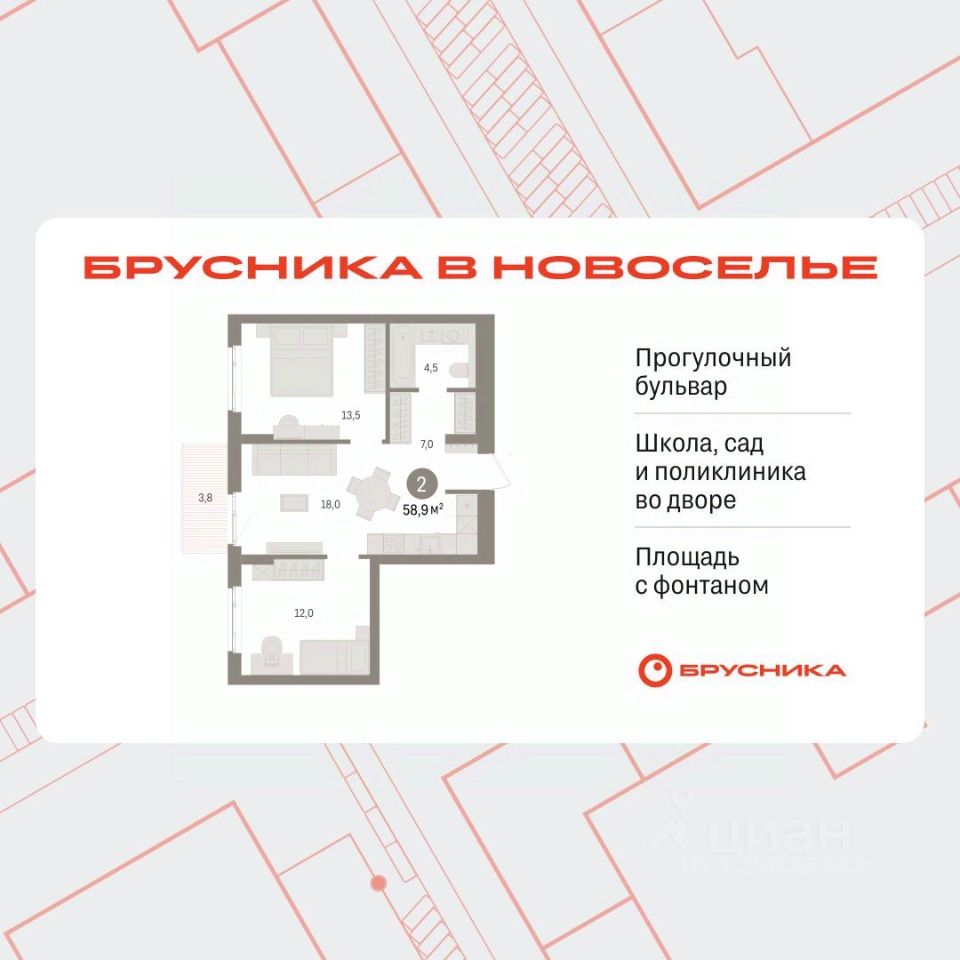 Просторная 2-комн. квартира с предчистовой отделкой в ЖК "Брусника в Новоселье" на 7 этаже. Общая площадь: 58.85 кв.м., жилая: 25.5 кв.м., площадь просторной кухни-столовой: 18 кв.м. Комнаты изолированные, все окна выходят на одну сторону. В квартире один балкон, один совмещенный санузел. Высота потолков 2.7 м.