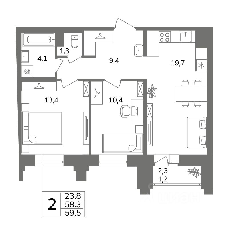 Просторная 2-комнатная квартира 59.5 м² с евро-планировкой в ЖК "Антверпен" от Л1 у м. Купчино
