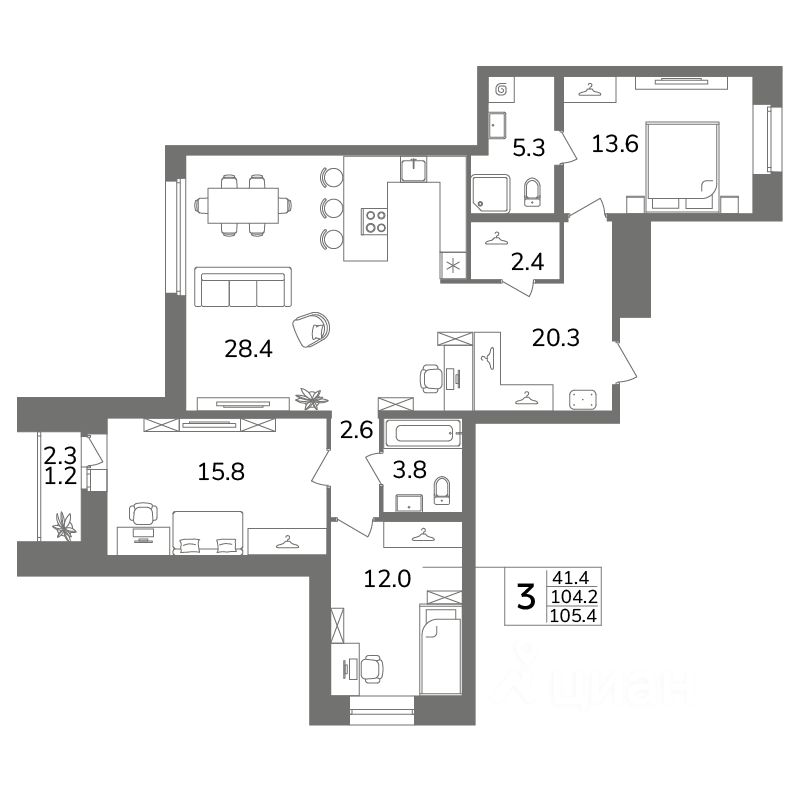 Просторная 3-комнатная квартира 105,4 м² с большой кухней-гостиной в ЖК "Антверпен" от Л1
