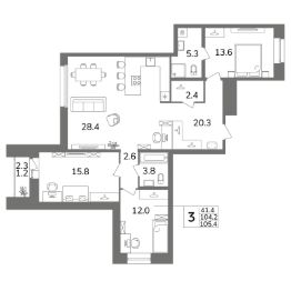 Предлагаем элитную 3-комнатную квартиру 105,4 м² с роскошной кухней-гостиной в престижном жилом комплексе бизнес-лайт класса "Антверпен" от застройщика Л1. Исключительно жилая атмосфера - в секции нет студий и 1-комнатных квартир, всего 9 этажей комфорта и приватности.