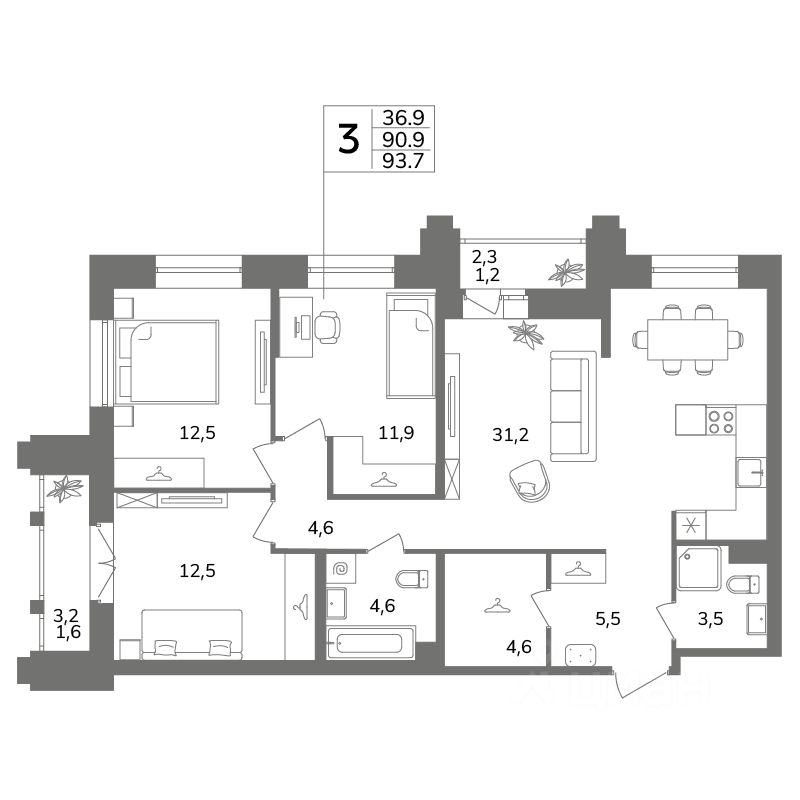 Просторная 3-комнатная квартира 105,4 м² с большой кухней-гостиной в ЖК "Антверпен" от Л1