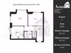 Квартира двухсторонняя, общей площадью 49.7 кв.м, расположена на 20 этаже кирпично-монрлитного дома 2021 года постройки.