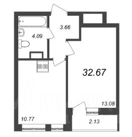 - Кухня 10,77 м², комната 13,08 м² с выходом на лоджию 2,13 м².