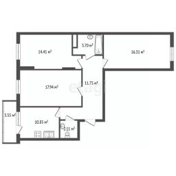 Объединенная кухня- гостиная (28.79 м.кв.), изолированная мастер- спальня (16.31 м.кв.), детская комната (14.41 м.кв.), совмещенный санузел, постирочная и просторный холл.
