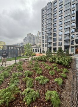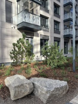 В жилом комплексе предусмотрен закрытый двор по периметру. На первых этажах комплекса находятся коммерческие помещения. В проект входит свой детский сад на 110 мест. Для владельцев автомобилей реализован теплый подземный паркинг на 93 места. Пространство располагается на подземном этаже и по объему занимает всю территорию земельного участка. Спуститься в паркинг можно на лифте прямо со своего этажа.