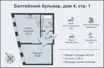 Просторная светлая квартира 44,6 м2 с большой кухней и комнатой.