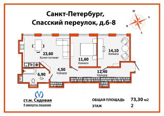 Продается прекрасная квартира в центре Санкт-Петербурга, на Спасском переулке. Общая площадь 73,3 кв. м, просторная кухня-гостиная 28.1 м2. Спальня правильной формы 11.4 м2, комната (кабинет или детская) 14.1 м2 . Все окна квартиры выходят в зелёный двор, закрытый от посторонних людей,поэтому в квартире всегда тихо и спокойно. Квартира находится на втором этаже пятиэтажного кирпичного дома, построенного в 1860 году. Высокие потолки в 3,2 метра создают атмосферу простора и света. До станций метро "Садовая", "Спасская" и "Сенная" всего 4 минуты пешком — это идеальное место для жизни в центре города.