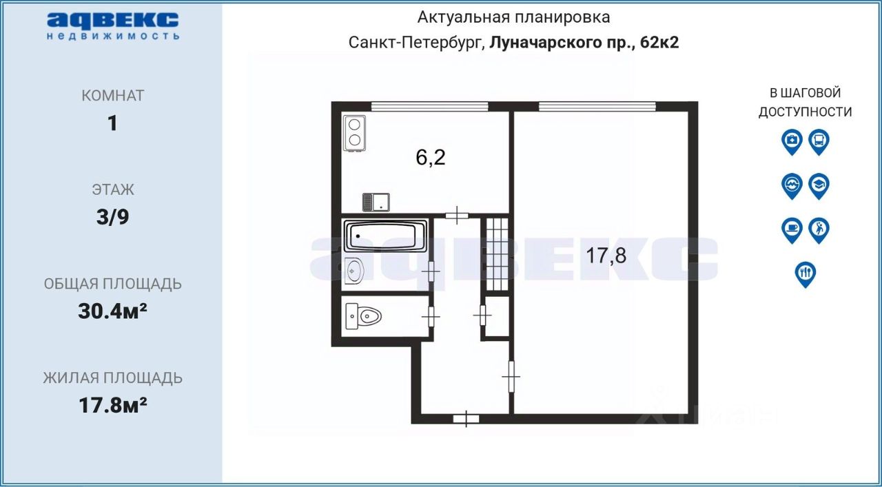 Продается ОДНОкомнатная квартира по адресу пр. Луначарского, д. 62, корп. 2.