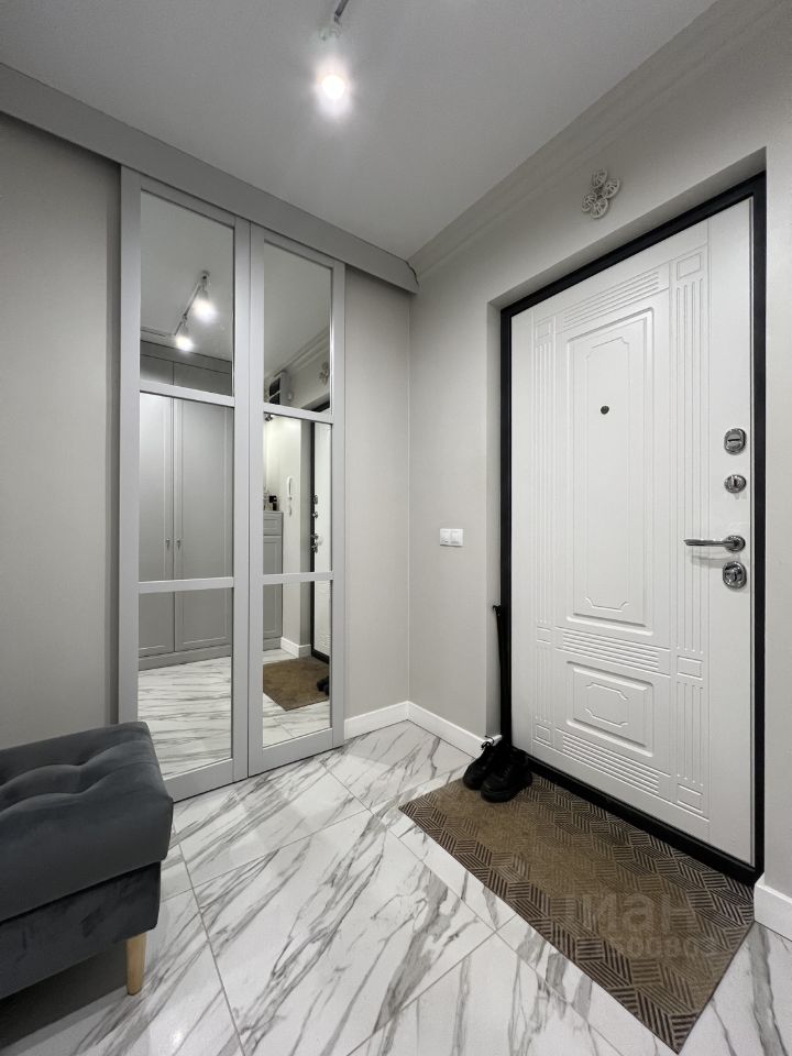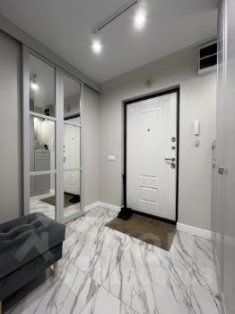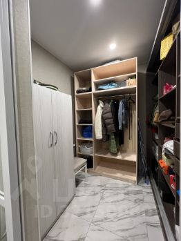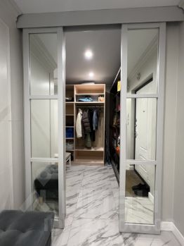 Просторная прихожая оборудована встроенной гардеробной  с зеркальными раздвижными дверьми и встроенным шкафом, которые изготавливались под заказ (МДФ с эмалью).