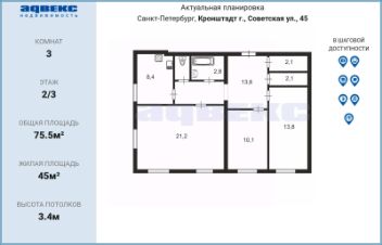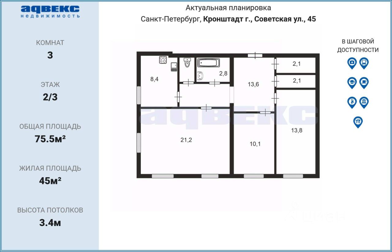 Предлагаем приобрести просторную трехкомнатную квартиру г. Кронштадт, улица Советская, дом 45.