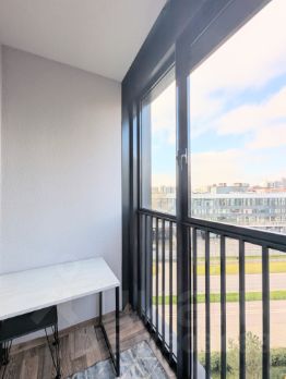 Удобная планировка с просторной кухней-гостиной и остекленной лоджией. Ремонт выполнен в спокойных светлых тонах.