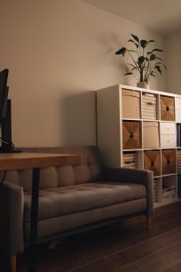 мебель из кабинета - два стола, диван, маленький ячеистый шкаф;