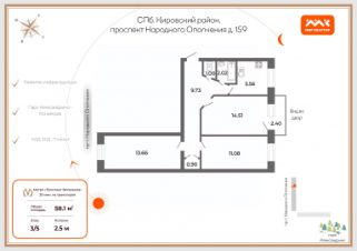 Просторные и светлые комнаты (14.2+13.7+11.1) кв. м., кухня 5,5 кв.м., ванная 2 кв.м., туалет 1 кв.м., коридор 9,37 кв.м., балкон 2,5 кв.м.