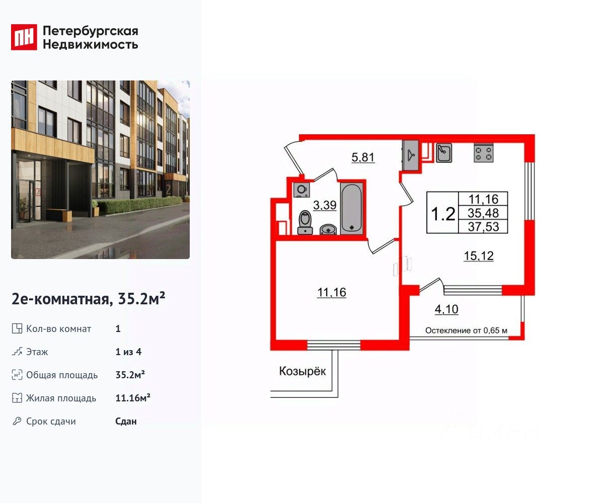 Удобная, классическая, функциональная европланировка, большая кухня-гостиная 15.12 м², просторная прихожая 5.81 м². Общая площадь квартиры - 35.2 м², жилая 11.16 м², высота потолка 2.77 м.
