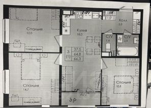 - Общая площадь 64,8 м² + лоджия 3 м².