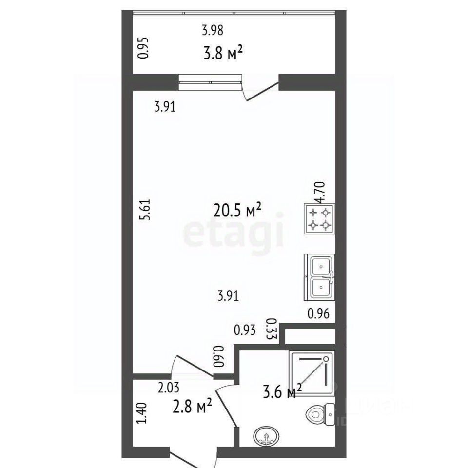 Студия общей площадью 26.9 м.кв. + лоджия- 3.98 м.кв.